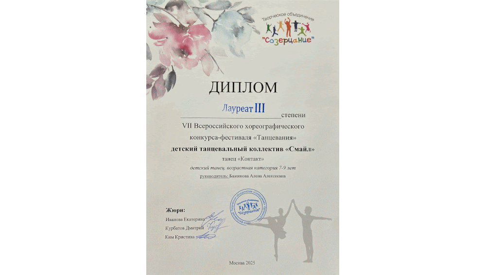 А неделей раньше младшая группа танцевального коллектива «Смайл» получила диплом лауреата третьей степени на VI Всероссийском конкурсе-фестивале «Танцевания», который прошёл в концертном зале Московского государственного института спорта и туризма.