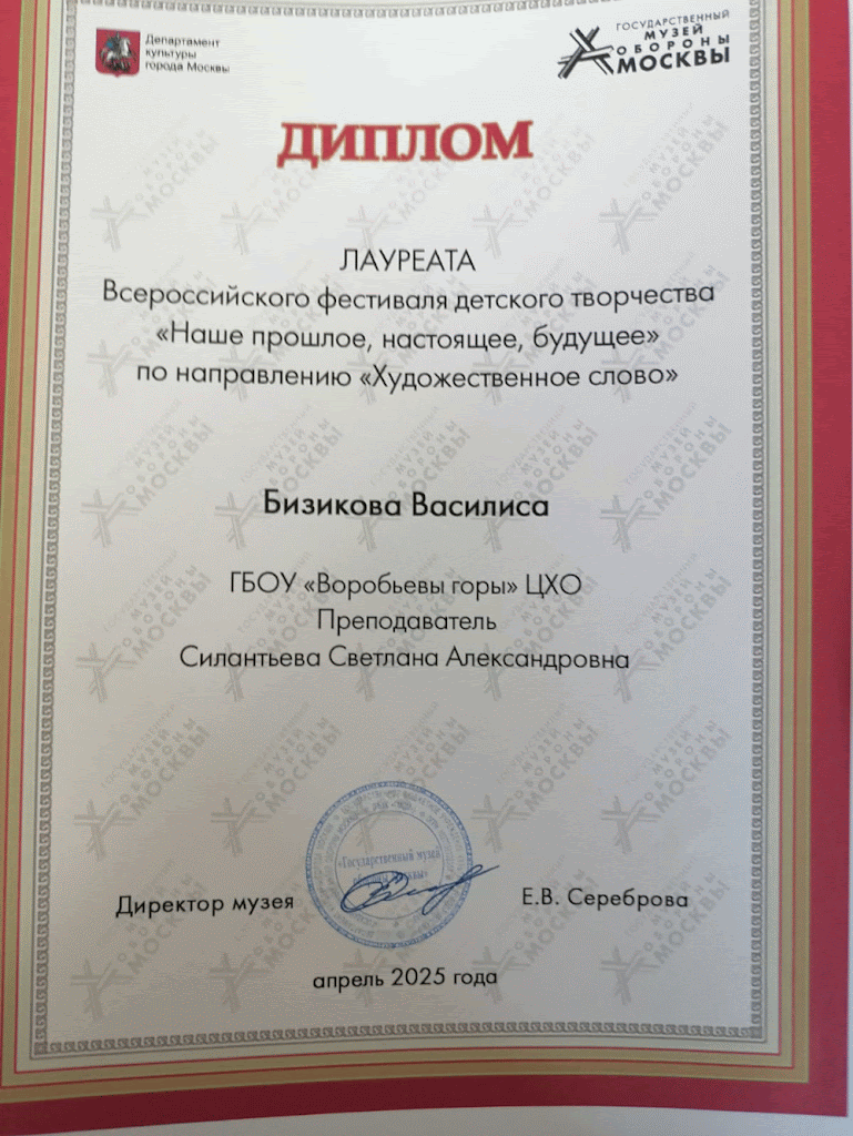 Всероссийский фестиваль «Наше прошлое, настоящее, будущее» посвящён 80-летию Победы советского народа в Великой Отечественной войне. Обучающиеся центра художественного образования получили награды. Диплом первой степени вручён Арине Писаренко, звания лауреата удостоена Василиса Бизикова.