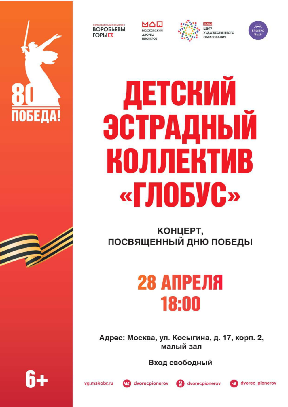 28 апреля 2025 года детский эстрадный коллектив «Глобус» представит вниманию зрителей концерт, посвящённый Дню Победы в Великой Отечественной войне 1941-1945 годов.