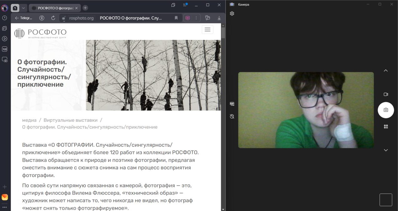 Виртуальные выставки стали важной частью занятий, посвящённых современной визуальной культуре и фотографии. Ребята познакомились с выставками «Новая волна», «НОРМКОР. Практики повседневности в современной молодежной фотографии», «15 минут до центра» и «О фотографии. Случайность/сингулярность/приключение».