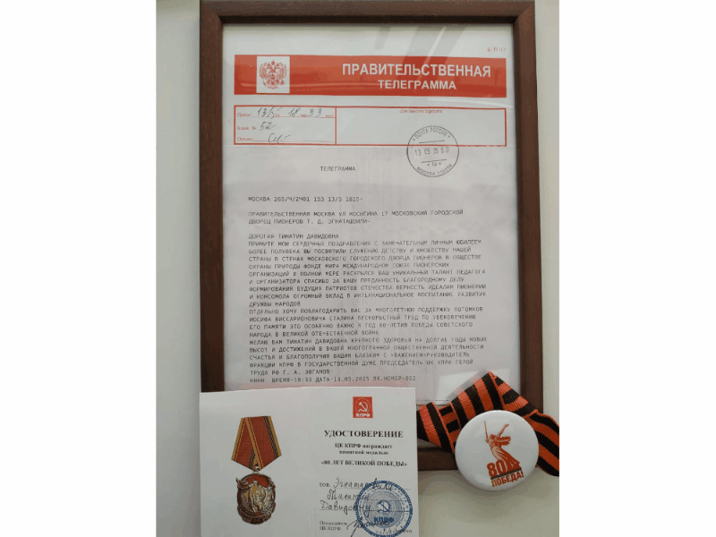 Г.А. Зюганов сердечно поздравил Тинатин Давидовну с юбилеем. Он высоко оценил заслуги Т.Д. Эгнаташвили в деле патриотического воспитания молодёжи Москвы и России и пожелал новых достижений в «многогранной общественной деятельности», которой занимается Тинатин Давидовна. Также он вручил заслуженному педагогу Московского дворца пионеров памятную медаль «80 лет Великой Победы».