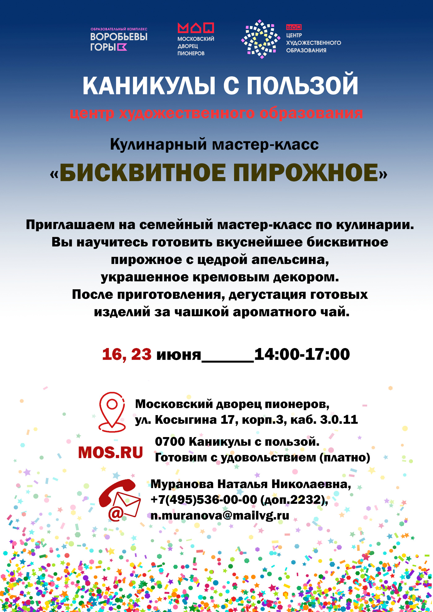 16 июня, 14:00-17:00. Кулинарный мастер-класс «Бисквитное пирожное».