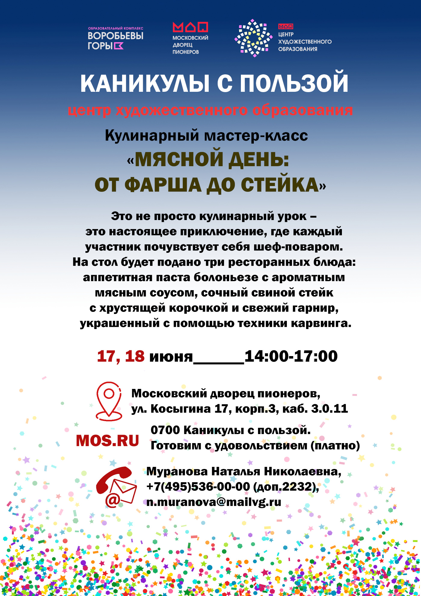 На мастер-классах ребята смогут приготовить вкусные маффины, аппетитную пиццу и продегустировать её за чашкой ароматного чая. А также принять участие по созданию ресторанных мясных блюд: пасты болоньезе с ароматным мясным соусом, свиного стейка и свежего гарнира, украшенного с помощью техники карвинга.