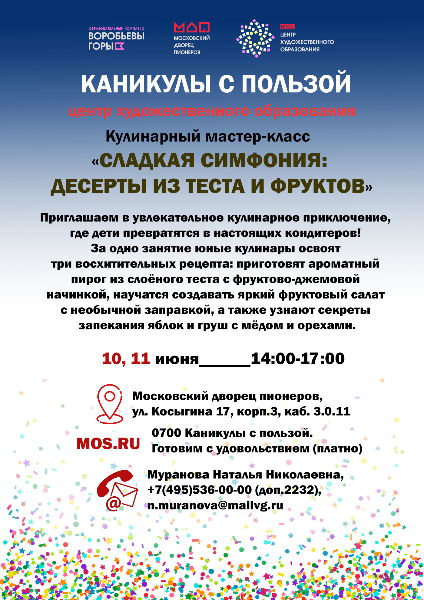 Возраст участников от 8 до 13 лет. Регистрация осуществляется на портале mos.ru по направлению 0700 «Каникулы с пользой. Готовим с удовольствием (платно)». Все продукты включены в стоимость мастер-класса. Стоимость мастер-класса — 4800 рублей.
