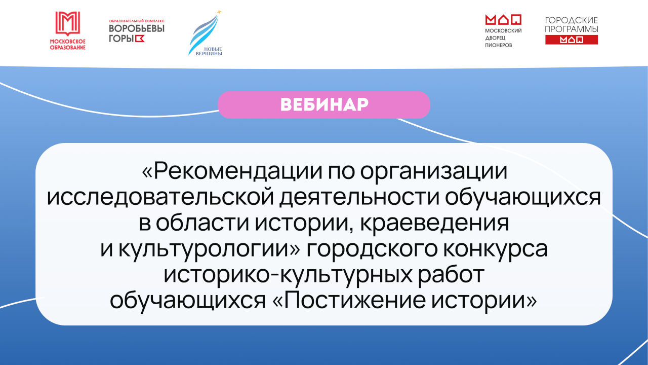 Знания, полученные на вебинаре, помогут участникам правильно организовать и провести исследовательскую работу, представить её на мероприятиях конкурса историко-культурных работ обучающихся «Постижение истории» в рамках городской конкурсной программы «Новые вершины», а также на других городских и всероссийских конкурсах.