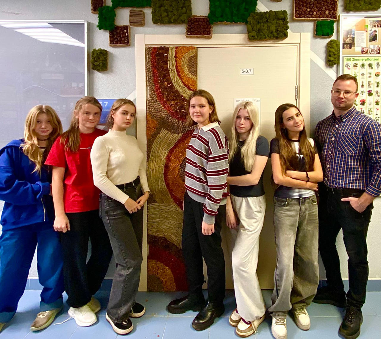 Вся красота, которая теперь украшает дверь кабинета флористики, была собрана самими кружковцами во время увлекательных экскурсий по ботаническому саду и живописной территории Московского дворца пионеров. Листья, веточки, шишки, ягоды – каждый элемент бережно отобран и превращён в прекрасные фактурные элементы этой композиции.