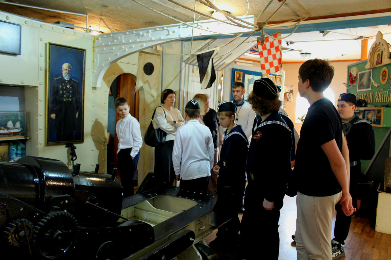Музей истории основания Российского флота настолько насыщен экспонатами, что за один день историю каждого из них передать невозможно, и поэтому в первое посещение для юных моряков с Воробьёвых гор была проведена общая, обзорная экскурсия.