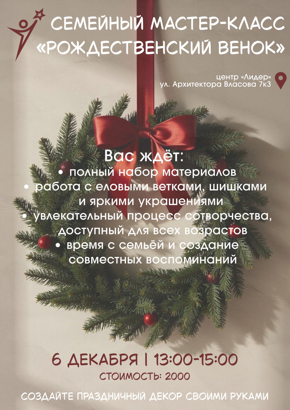 Участники занятия смогут погрузиться в атмосферу наступившей зимы, провести время с близкими и создать уникальный декор, наполненный теплом и семейной магией, а также смогут своими руками создать символ уюта и новогоднего настроения.